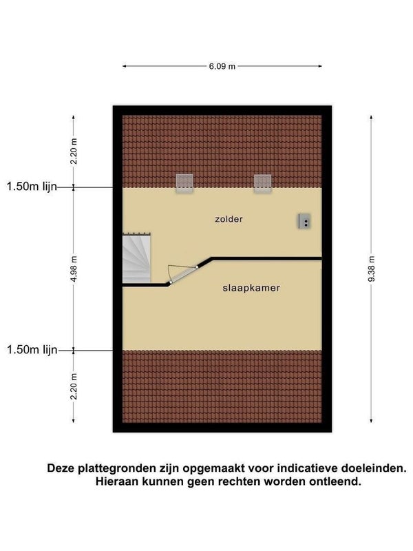 The attic floor is divided into a bedroom (15m2) and an equally large hobby / laundry / work space. The central heating boiler is also installed in this space. The ridge height is 3.05m.