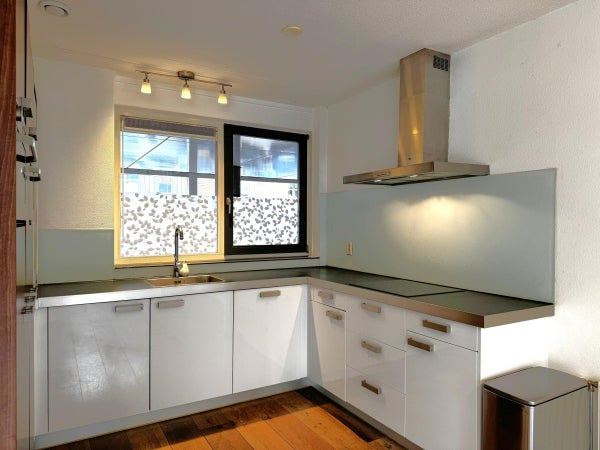 The front door leads to the hallway, which provides access to a storage room, the toilet, the meter cupboard, a storage closet, the stairs to the first floor, and the living room. The bright living room overlooks the west-facing back garden. At the front is the luxurious kitchen, fully equipped with a refrigerator, a freezer, a combination microwave oven, a dishwasher, an induction hob, and an extractor fan.