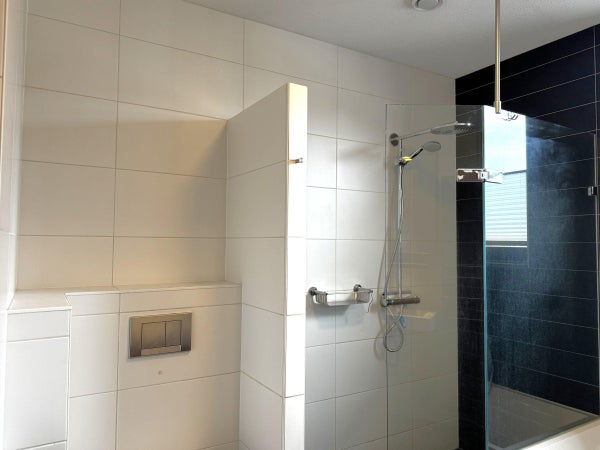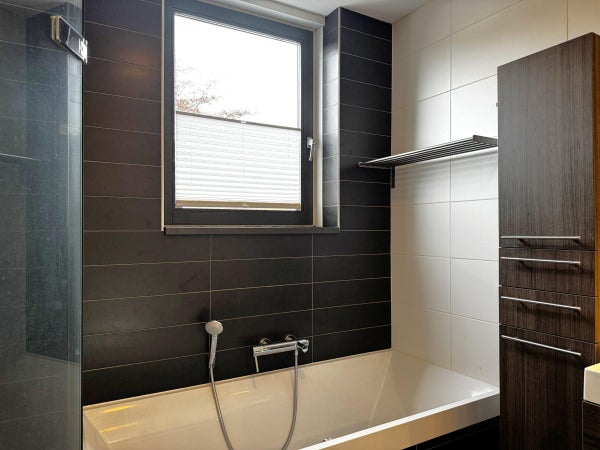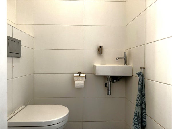 A fixed staircase leads to the landing on the top floor. From the landing, three (bed)rooms, a closet with connections for the washing machine and dryer, and the second bathroom can be reached. This bathroom has a shower, a sink with storaget, and a designer radiator.