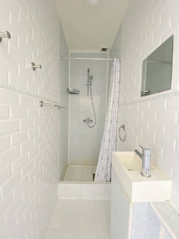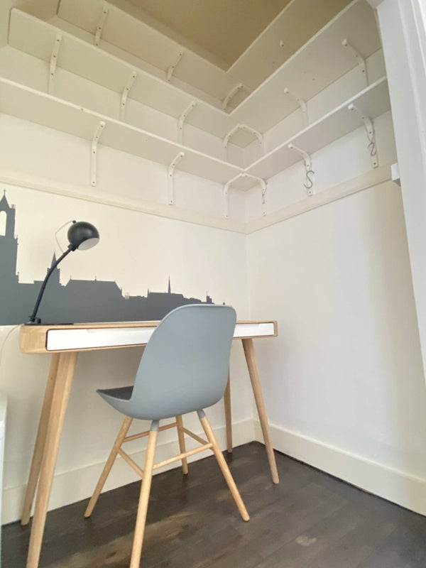 Landing with laundry with extra storage space. Master bedroom and a second room furnished as a study. Bathroom with shower and sink.
