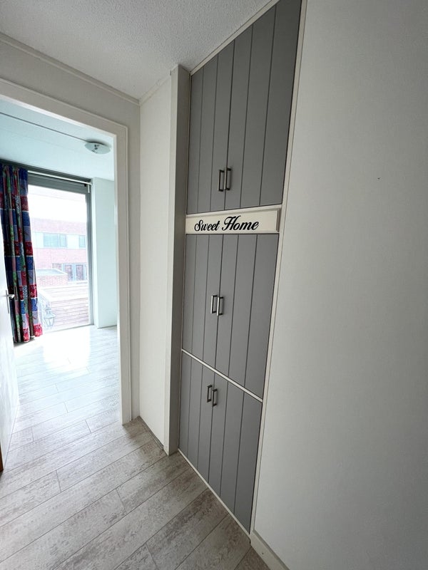 Hall/entrance with cloakroom, fuse box, toilet, staircase and access to the living room. Free parking at the front with a small front garden for bicycles.