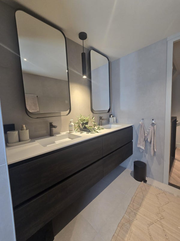 - Luxury bathroom with double vanity and walk-in shower