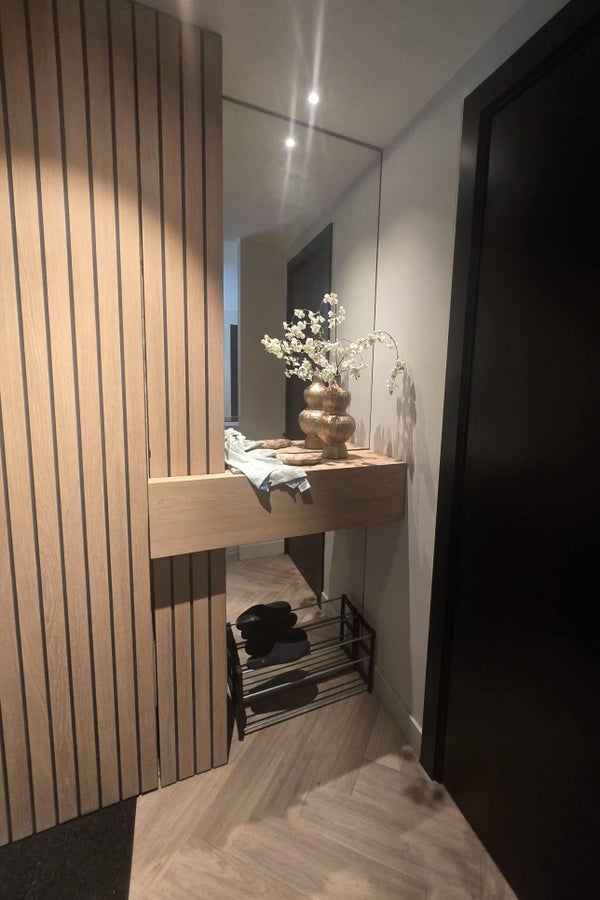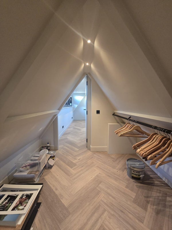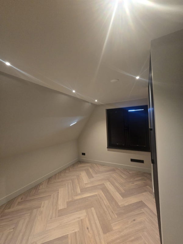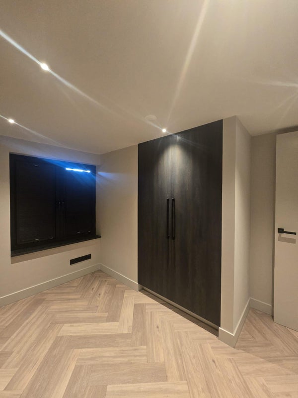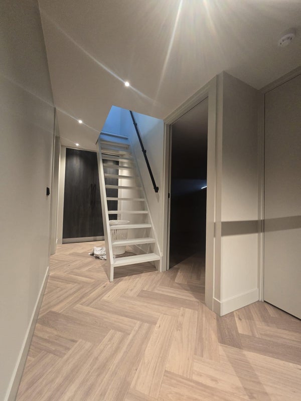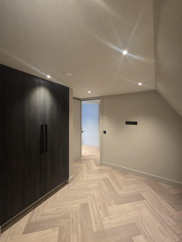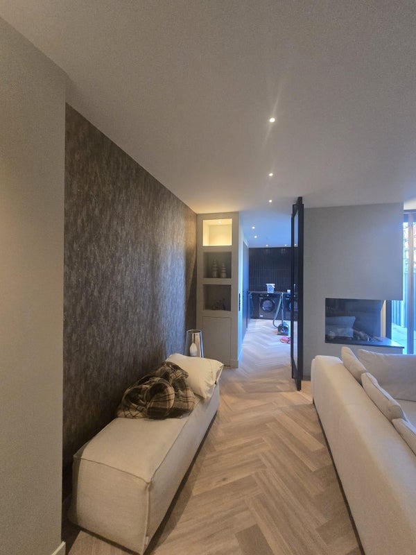 The ground floor features a spacious living area with a luxury open-plan kitchen, complete with a large kitchen island and high-end built-in appliances. The living and dining areas flow seamlessly and are finished with beautiful herringbone flooring, sleek plastered walls and subtle recessed lighting.