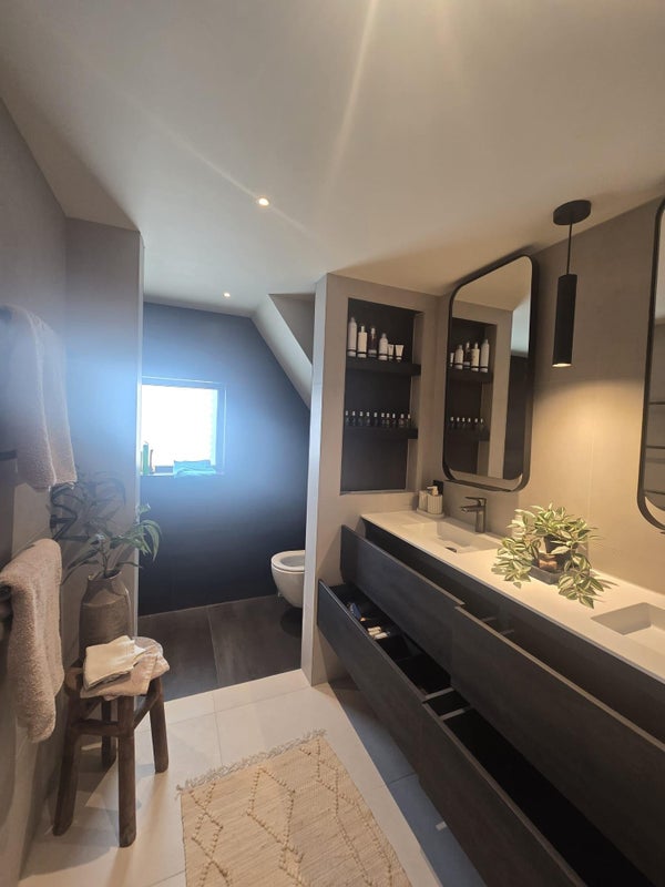 On the first floor, there are two bedrooms, including a spacious master bedroom with custom-built wardrobes. The bathroom on this level has a luxury, hotel-style appearance and is fitted with a double vanity, high-quality finishes and a generous walk-in shower. There is also a separate toilet.