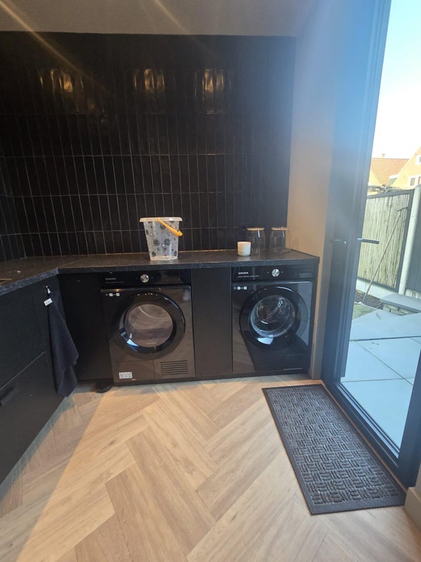 Adjacent to the living area is a practical utility / laundry room of approximately 10 m², equipped with a washing machine setup and providing direct access to the rear garden. A highly functional additional space that perfectly suits comfortable family and expat living.