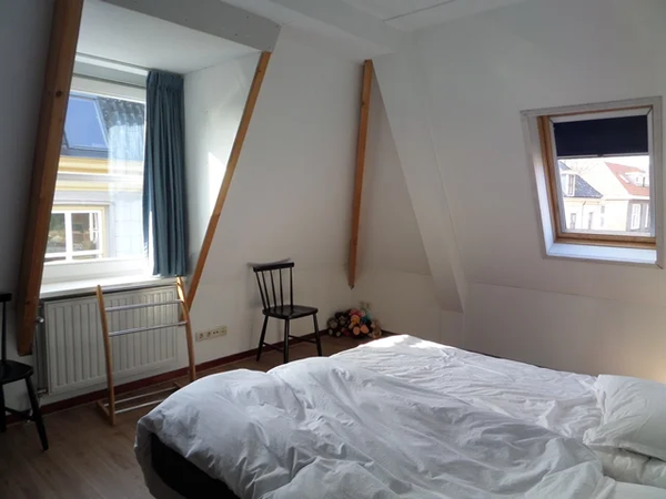 Here you will find a spacious room at the back with a walk-in closet and an extra bedroom at the front, also furnished with a double bed.