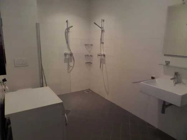 On this floor, at the front, there is a spacious study (approx. 18 m²) with desks. At the back is a cozy bedroom with a double bed. The modern bathroom is equipped with a walk-in shower, double sink, and toilet.