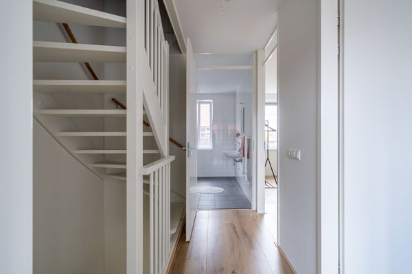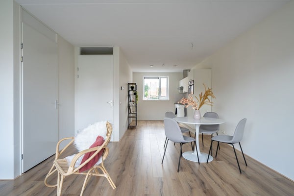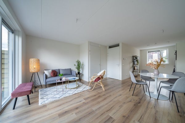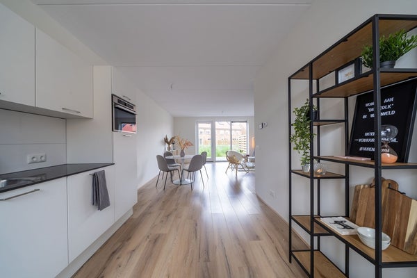 Spacious hall with a separate toilet, spacious living room with a beautiful view over 'the kolk' and a luxury open kitchen with various built-in appliances from Whirlpool such as a combi oven/microwave, extractor hood, dishwasher, and electric cooktop. The kitchen features a soft matte finish and a 12mm black composite stone countertop.