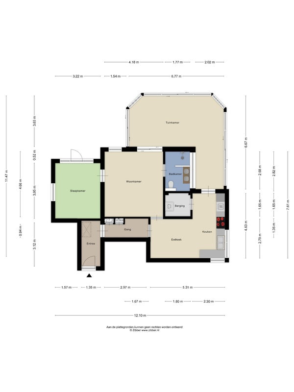 The ground floor flat is accessed via a private entrance at the front of the building. A hallway with a meter cupboard and wardrobe leads to the large dining area with open-plan kitchen.