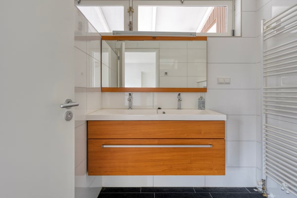 The bathroom has a double sink with mirror cabinet, a walk-in shower, towel radiator and a wall-mounted toilet.