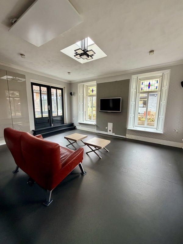 The spacious living room is characterised by impressive architectural elements, lots of natural light and beautiful stained glass details throughout the property. There is also a spacious separate TV room with a designer sofa, ideal for relaxing.
