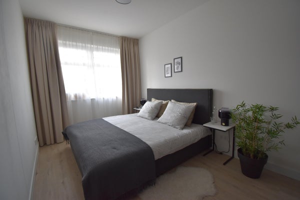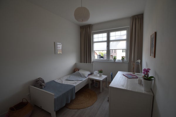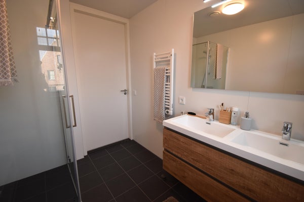 Via the stairs in the hall, we reach the 1st floor. Here you will find 3 spacious bedrooms, two of which are at the back of the house. The bathroom features luxury sanitary ware: a double sink, walk-in shower, wall-mounted toilet, and designer radiator.