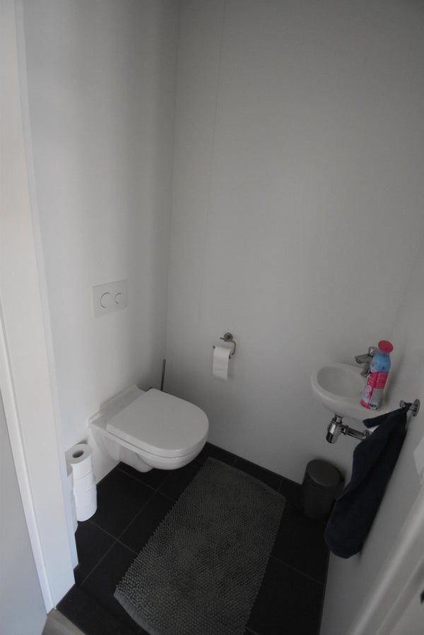 With the exception of the toilet and the storage room under the stairs, the entire ground floor and first floor have underfloor heating. All walls are finished, and the floors are covered with PVC flooring.