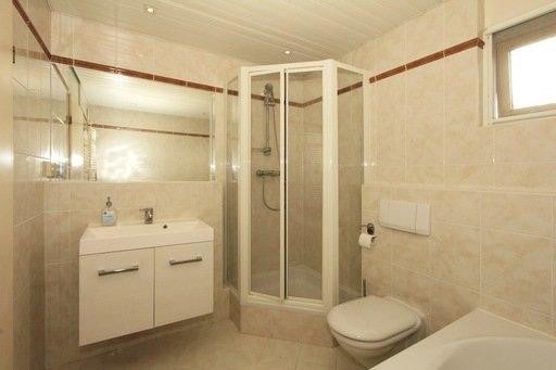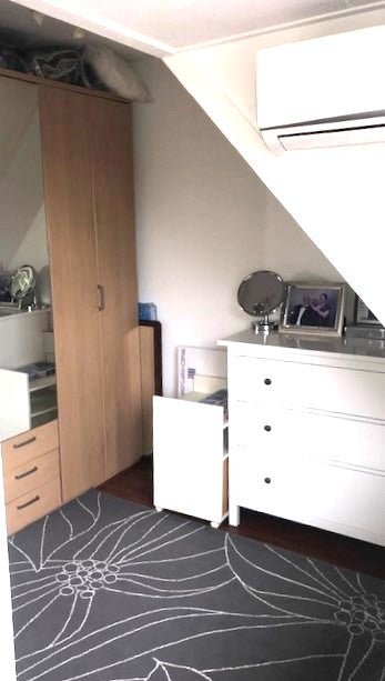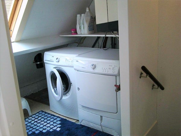 A fixed staircase leads to the attic floor. The washing machine and dryer are located on the spacious landing. There is also a spacious attic room here, which can be used as a bedroom. The space behind the bulkheads is not available.