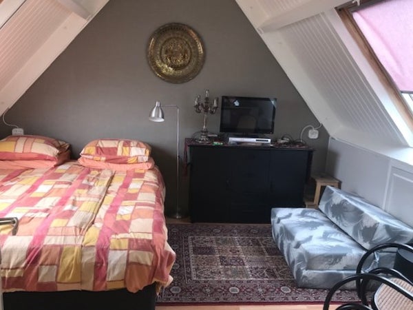On the first floor are two bedrooms. The bedroom at the rear has a single bed that can be extended into a double bed. There is also a desk and chair in this bedroom. The bedroom at the front offers a beautiful view of the water thanks to the large dormer window. This bedroom has a double bed and a large linen closet. The bathroom with a bathtub, separate shower, and a second toilet is also located on this floor.
