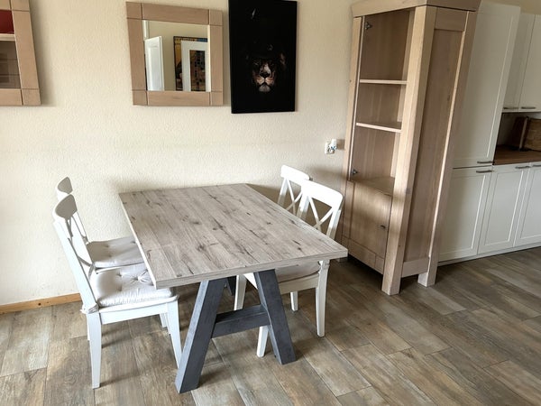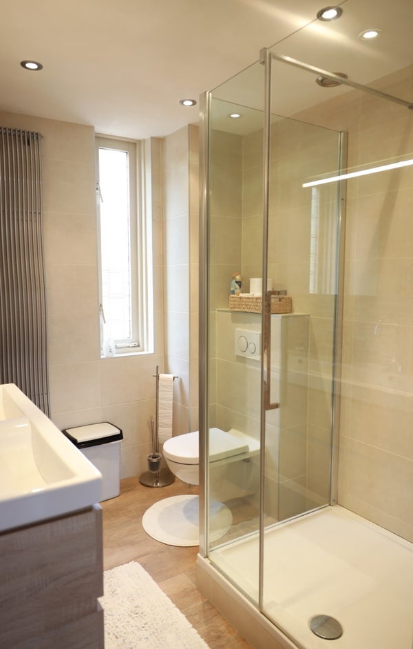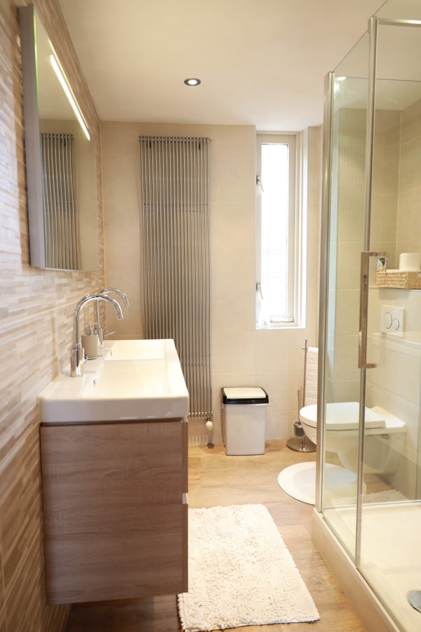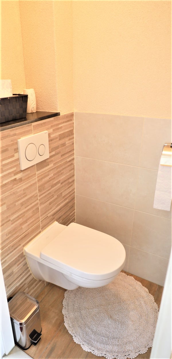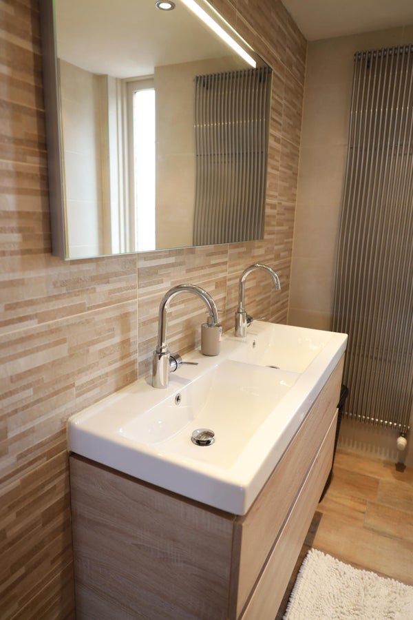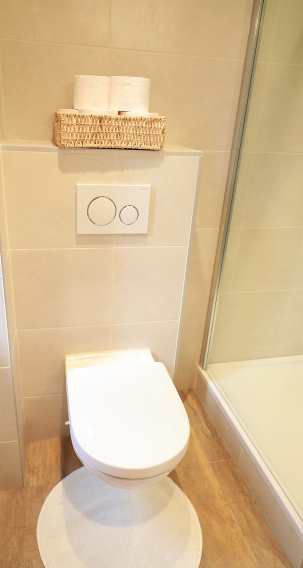 The first floor features a landing, which provides access to all rooms. At the front is the modern bathroom with a shower, a double vanity unit, and a toilet. There are three bedrooms on this floor. The master bedroom is at the front and has a double bed (with a new mattress) with an electric slatted base and a wardrobe. The second bedroom is at the rear and has a double bed (with a new mattress, 140x200 cm) with an electric slatted base. The third room at the rear can also be used as a bedroom or, for example, a study.