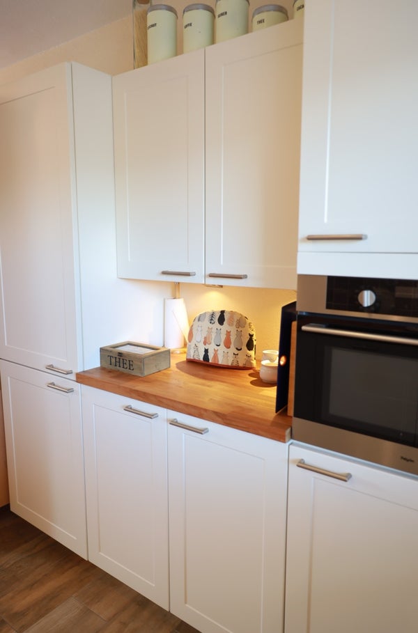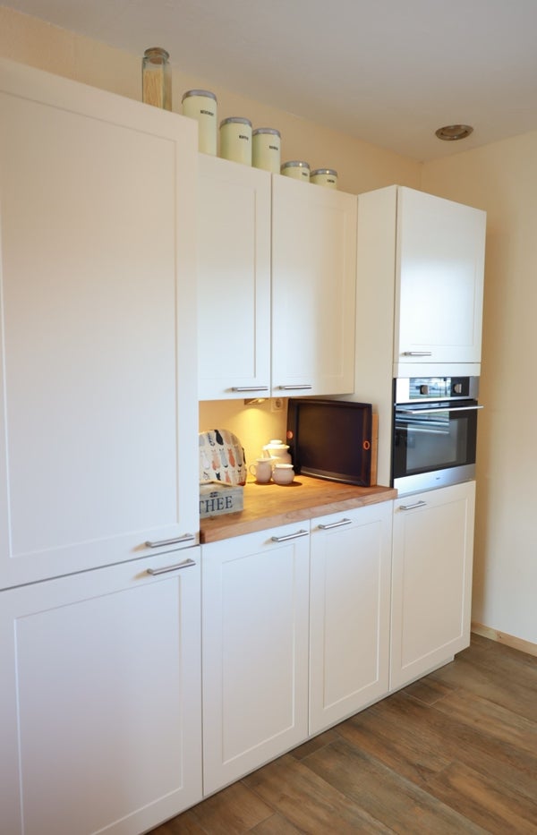 Entrance hall with meter cupboard, toilet, and staircase. At the front is the kitchen, equipped with built-in appliances, a stainless steel extractor hood, gas cooktop, combination oven, fridge-freezer, and (new) dishwasher. The kitchen is open to the bright living room at the rear, which has a tiled floor, underfloor heating, a storage cupboard, and a door to the large back garden with a brick shed.