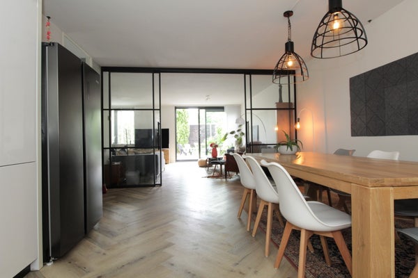 Entrance hall with toilet, staircase and access to the storage room (can also be used as an office, for example). Very spacious, garden-oriented living room with beautiful herringbone floor and sliding doors to the garden. Double steel doors to the spacious kitchen. The modern kitchen is equipped with an induction hob with extractor hood, dishwasher, refrigerator, freezer, combi oven, steam oven and coffee maker.
