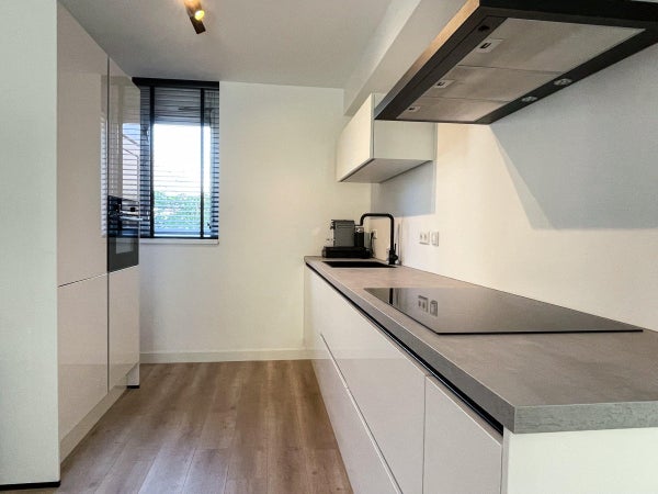La cuisine est équipée de divers appareils encastrés tels qu'une plaque de cuisson à induction, un réfrigérateur/congélateur, une hotte aspirante, un lave-vaisselle et un four à micro-ondes combiné.
