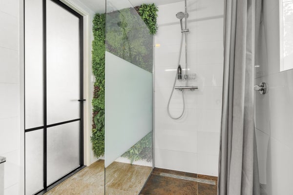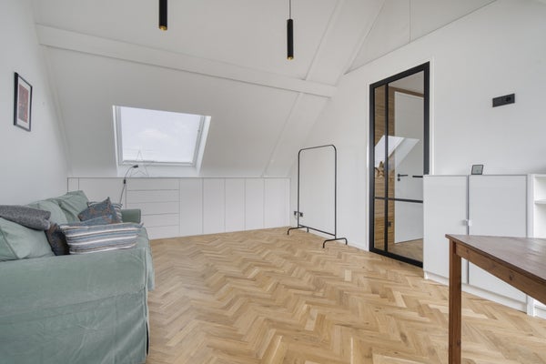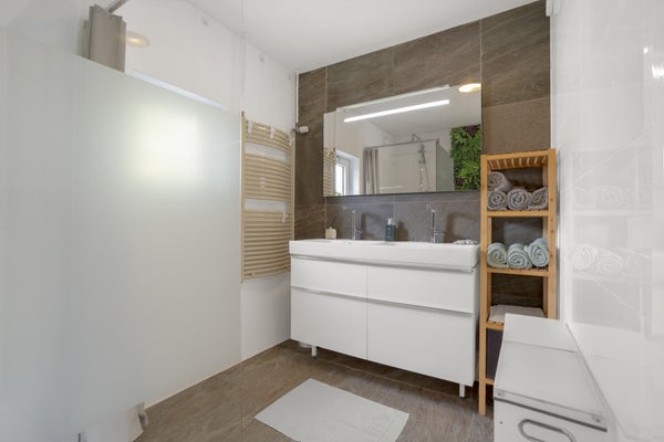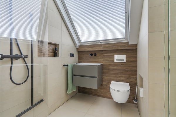 Le grenier est également équipé de chauffage au sol et dispose d'une grande pièce lumineuse ainsi que d'une seconde salle de bain avec douche, lavabo et troisième toilette. Parfait comme chambre supplémentaire, bureau ou chambre d'amis.