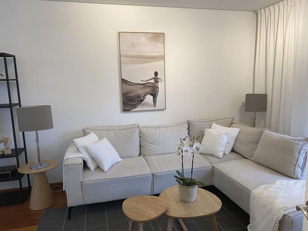 Entrée/couloir, toilettes avec petit lavabo, salon avec parquet et accès à la cuisine entièrement équipée (réfrigérateur-congélateur, plaque de cuisson au gaz, four, micro-ondes, lave-vaisselle)