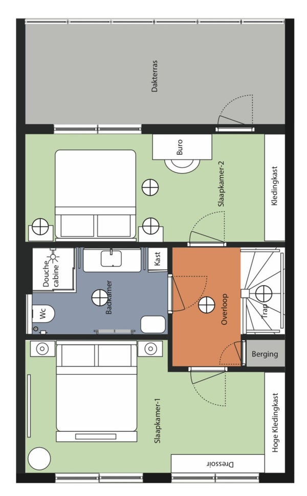 Le premier étage dispose de quatre chambres bien dimensionnées, dont deux à l'avant avec accès à un balcon compact à l'est. À l'arrière, se trouvent également deux chambres. Au centre de cet étage se trouve la salle de bains, équipée d'une spacieuse douche à l'italienne, d'un lavabo, d'un second toilet, d'un radiateur design, d'une machine à laver et d'un sèche-linge.