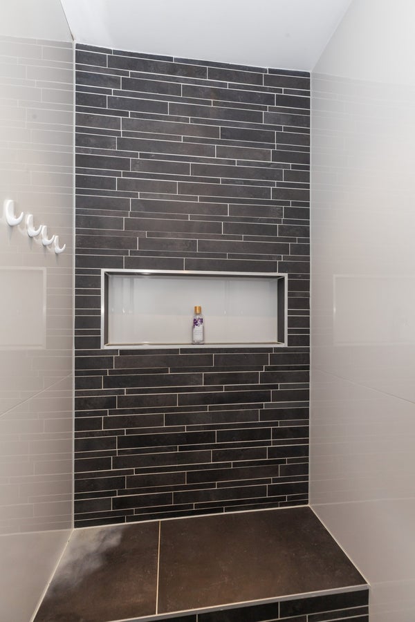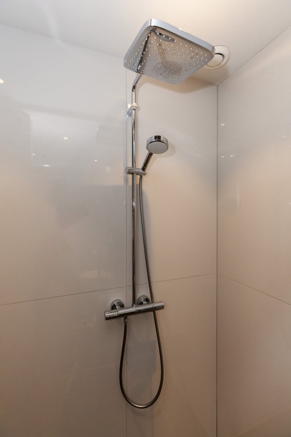 Couloir. Chambre très spacieuse 1 avec lit double, grande armoire et commode. La 2ème chambre comprend un lit, une armoire et un bureau avec chaise. La 3ème chambre a un lit simple. La salle de bain spacieuse dispose d'un toilette flottant, d'une grande douche à l'italienne et d'un meuble lavabo avec double vasque. Le sol est en vinyle.