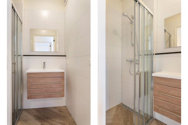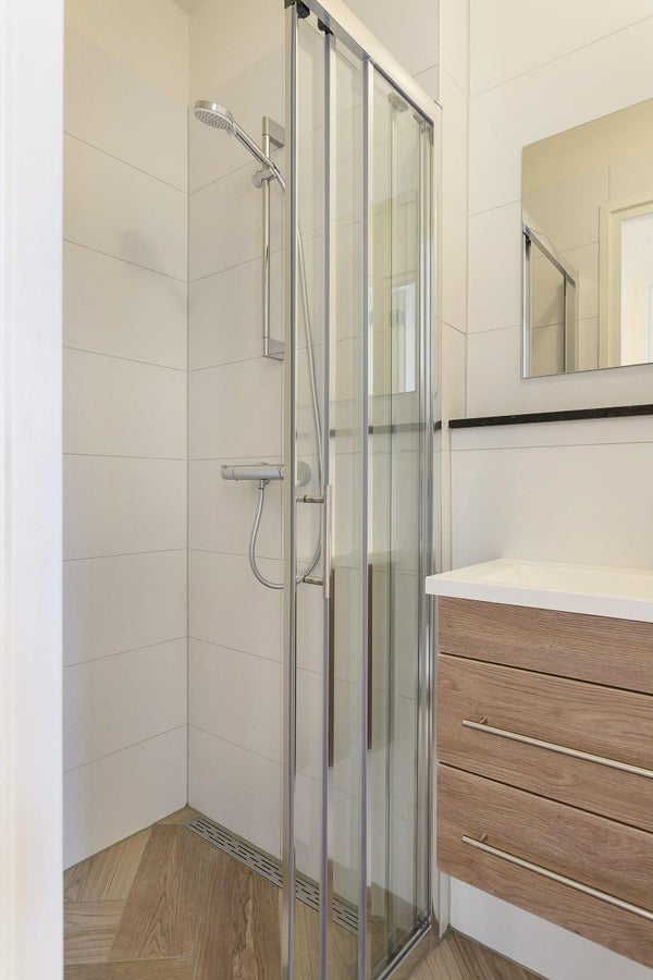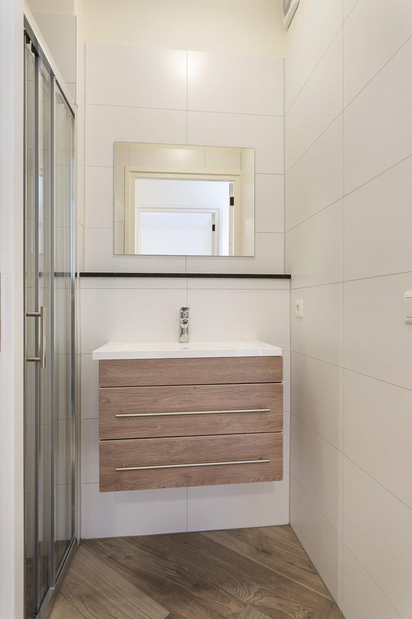 La salle de bain est équipée d'une cabine de douche et d'un lavabo avec miroir et meuble.