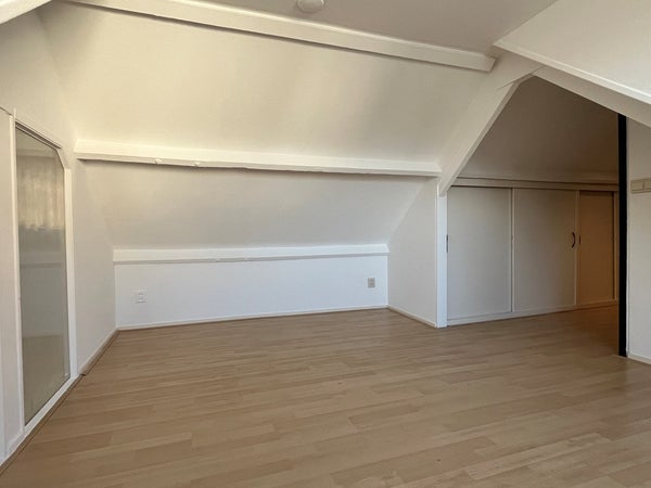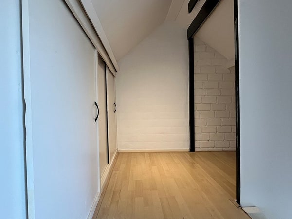 Au premier étage, il y a un palier avec beaucoup d'espace de rangement sous le toit en pente et la chambre avec lucarne.