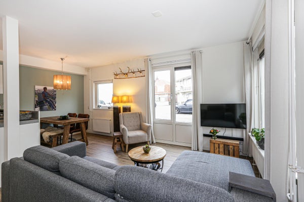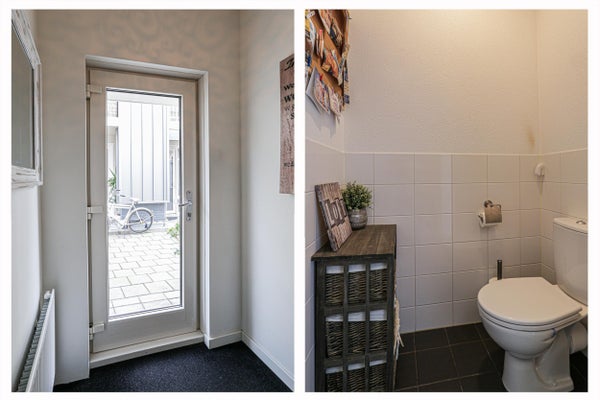 À l'avant, se trouve une terrasse où vous pouvez vous asseoir confortablement à l'extérieur. Par l'entrée, vous accédez au hall avec espace de rangement pour les vêtements, un toilette séparé, l'escalier vers le haut et l'accès au salon.