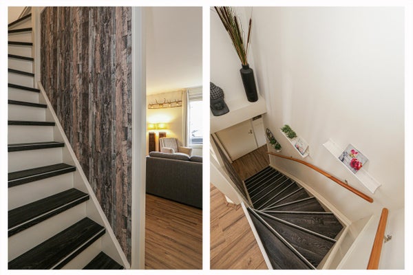 Sur le palier, vous avez accès à la salle de bain et à deux chambres. La chambre principale s'étend sur la largeur totale de la maison et dispose de fenêtres des deux côtés, ce qui rend la pièce agréablement claire. La deuxième chambre est située à droite et est meublée d'un lit et d'un grand dressing. À côté de cette chambre se trouve la salle de bain avec douche à l'italienne, lavabo et un meuble de rangement pratique.