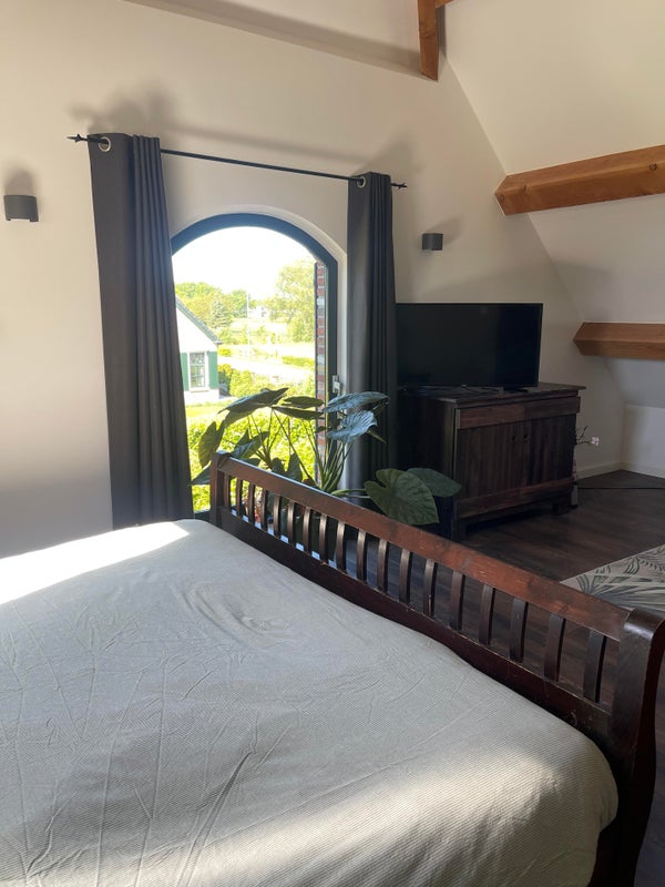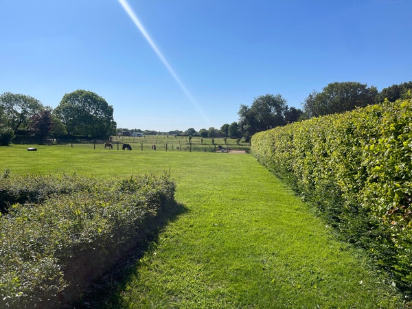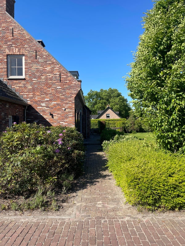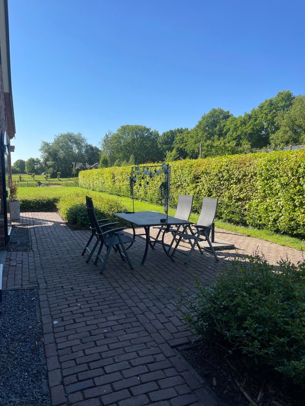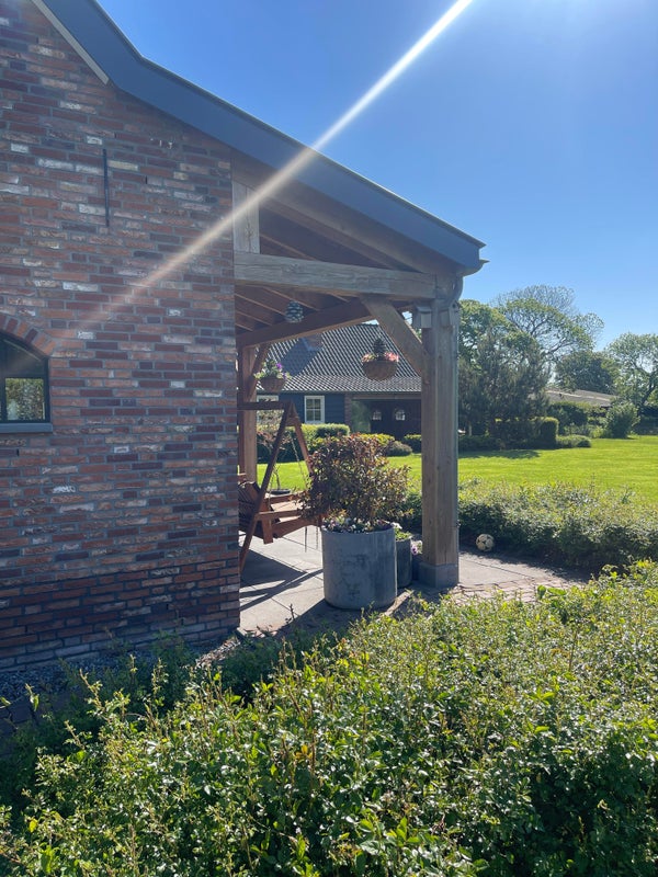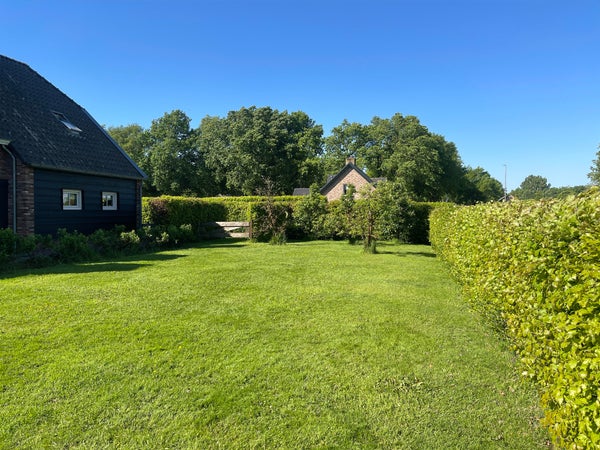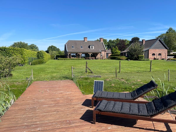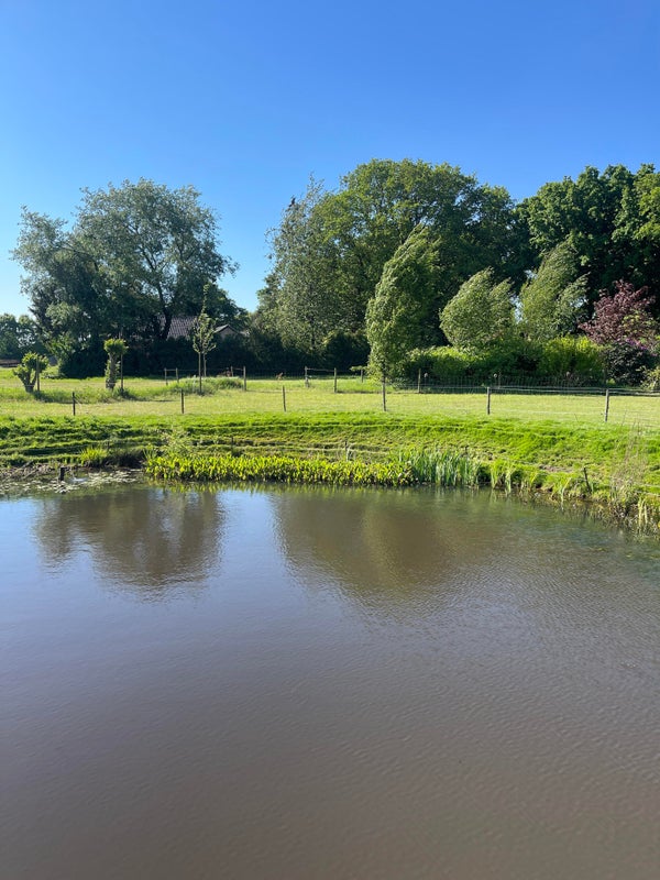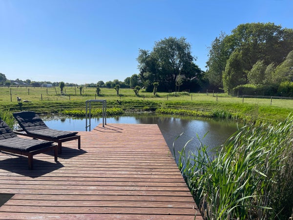 Le jardin arrière offre une vue spacieuse et rurale sur les prés et le grand étang de baignade avec quai. Une tondeuse robotisée "fonctionne" pour garder la pelouse bien entretenue, et un contact avec un jardinier a déjà été préparé pour vous soulager de l'entretien limité.