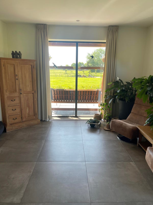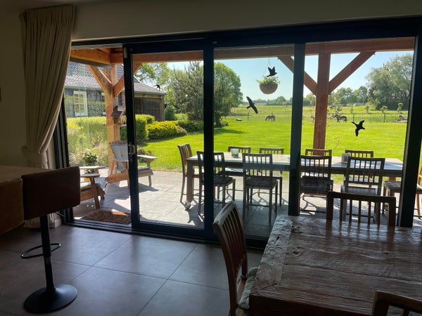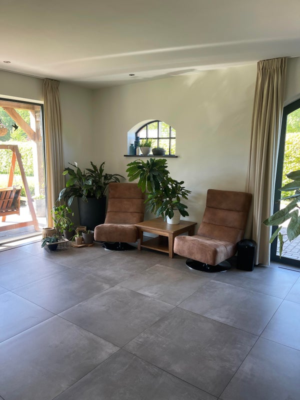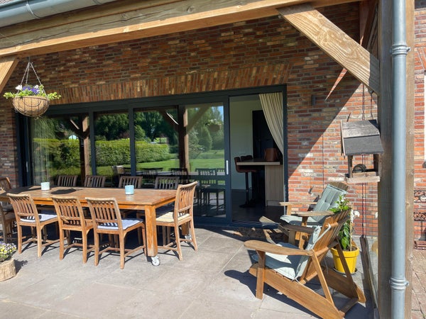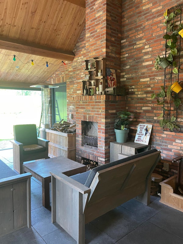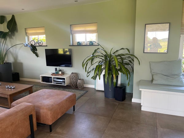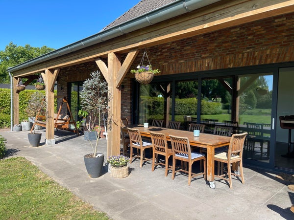 Le salon avec cheminée et différents coins salon est en connexion ouverte avec la cuisine. Grâce aux nombreuses fenêtres, cet espace est lumineux et vous pouvez profiter de la vue sur la campagne environnante, le magnifique jardin avec l'étang de baignade et diverses terrasses (couverts) pendant les saisons ensoleillées. Pour les journées d'hiver, il y a une belle cheminée ouverte dans le coin salon, ce qui en fait un endroit agréable pour passer du temps à l'intérieur aussi.