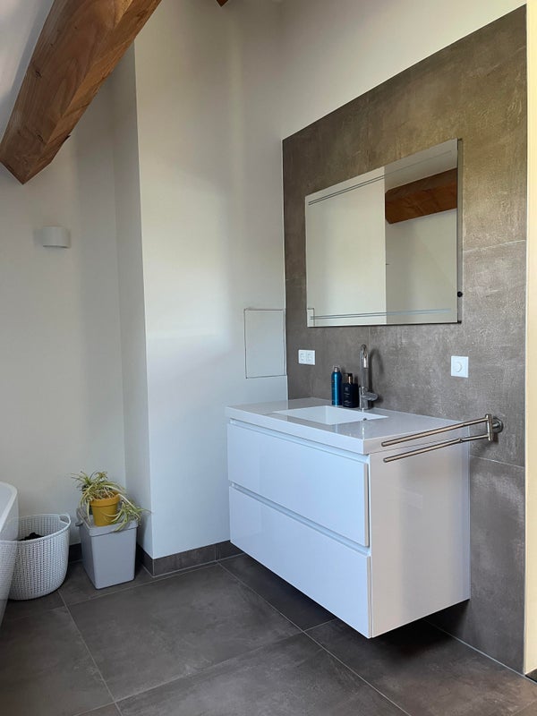 La salle de bain lumineuse est équipée d'une vaste douche à l'italienne et d'un meuble avec lavabo, miroir et éclairage.
