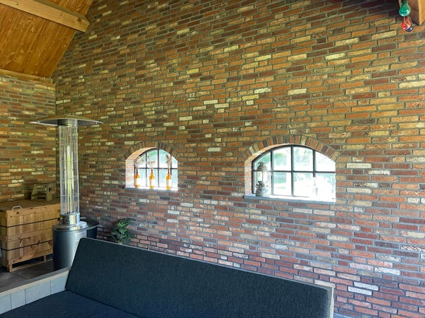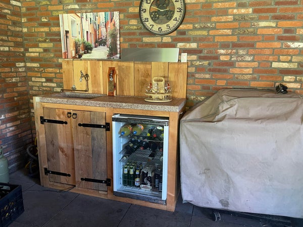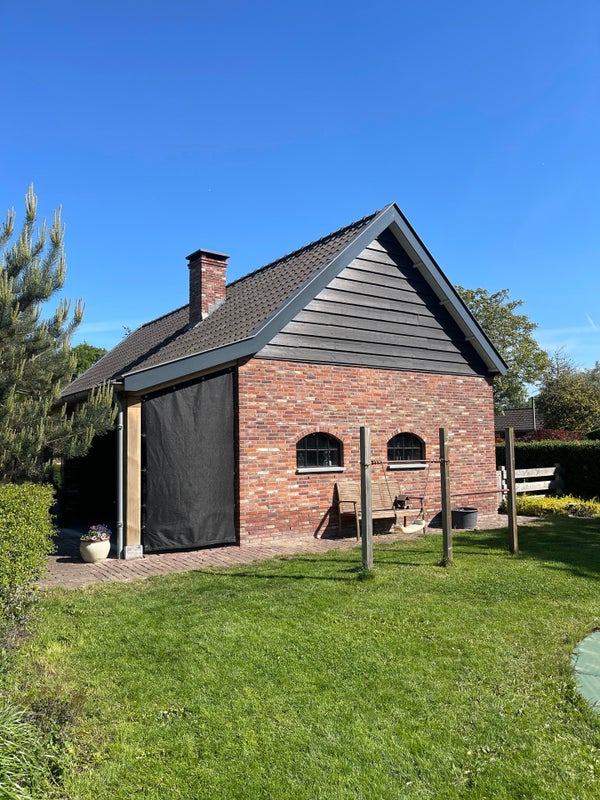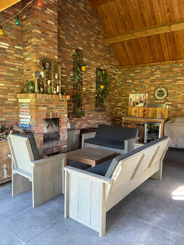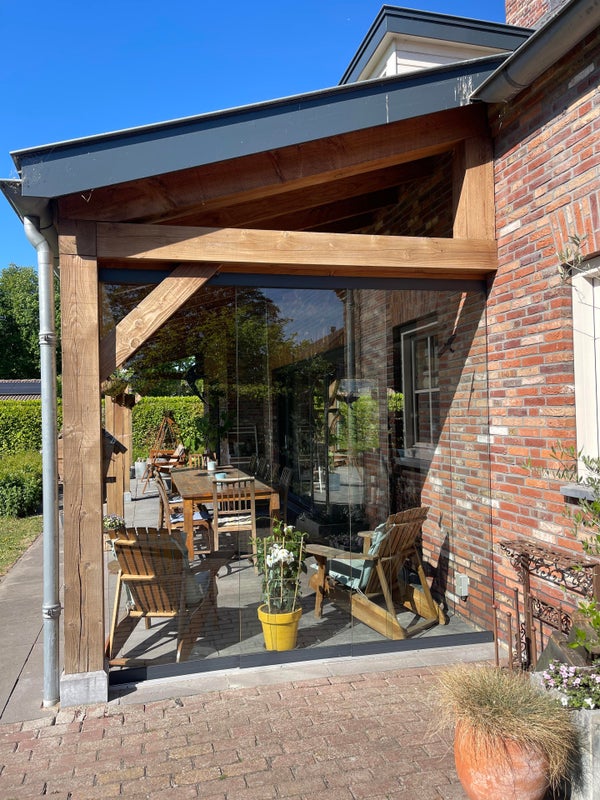 Derrière le garage, vous trouverez un abri. Cet espace protégé par des murs en verre est équipé d'une cheminée et d'un coin cuisine avec réfrigérateur à vin, raccordement d'eau/évacuation et barbecue et électricité et est décoré avec goût pour des soirées agréables à l'extérieur.