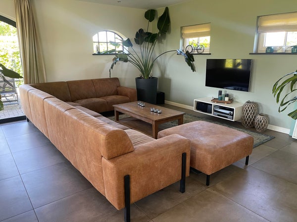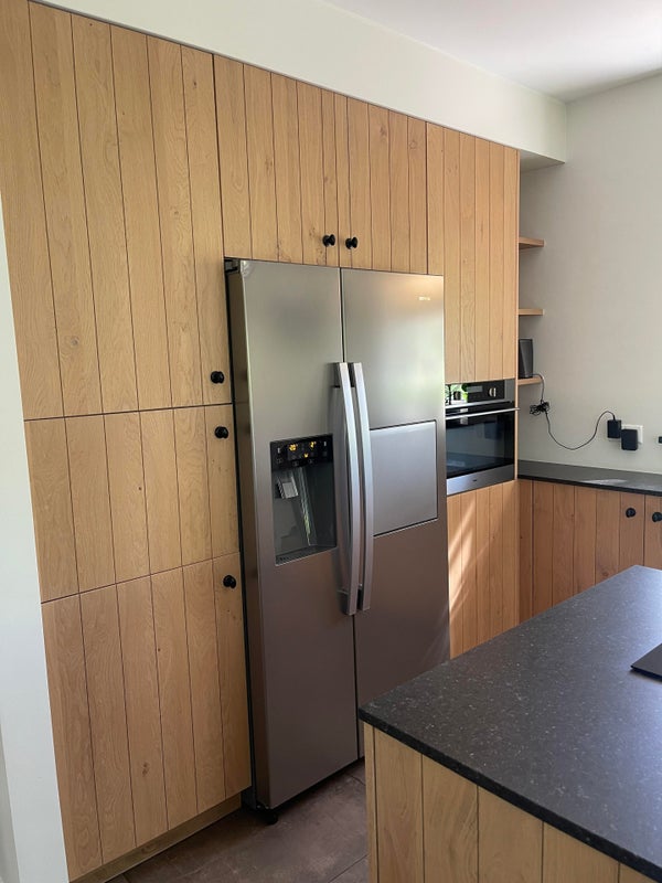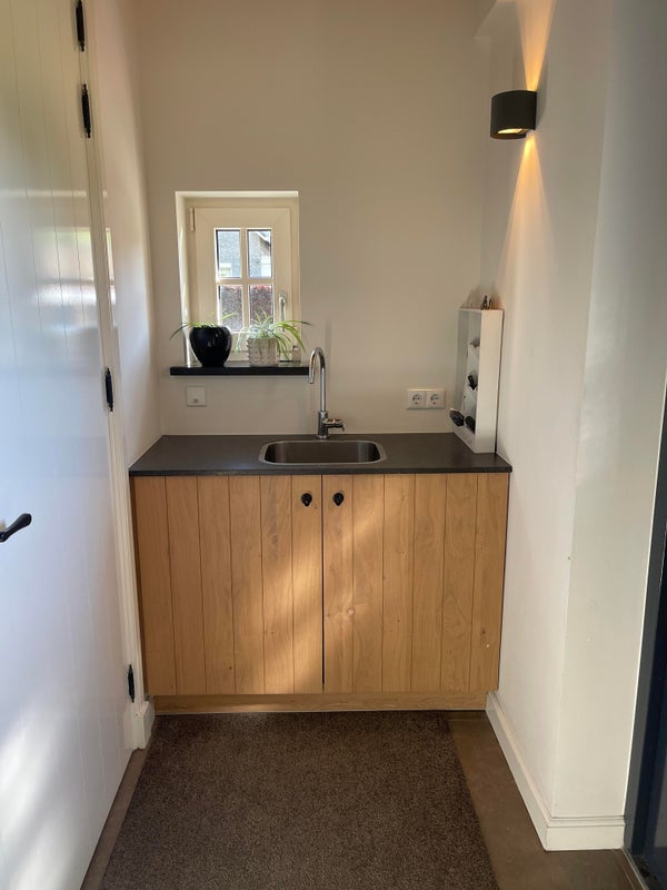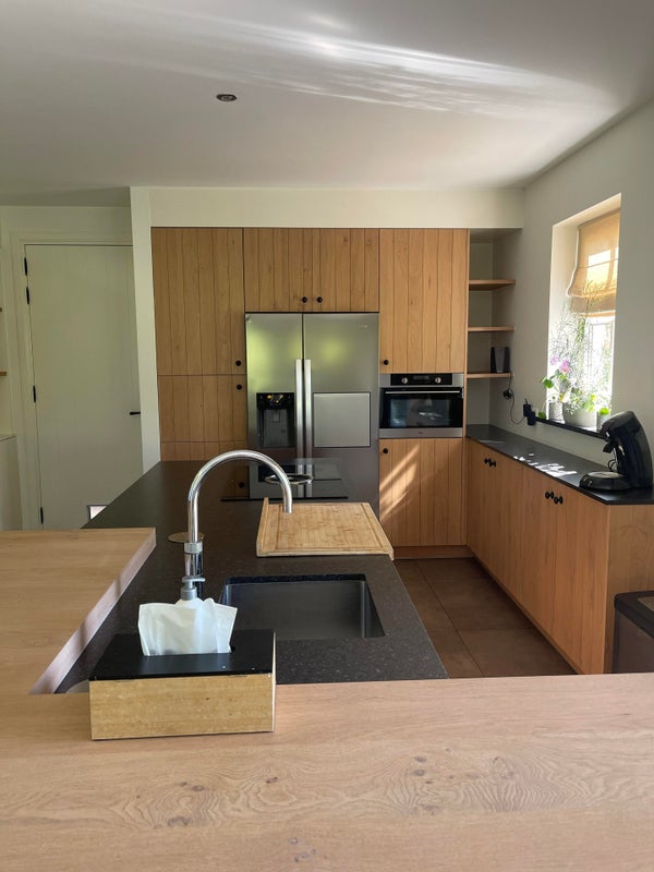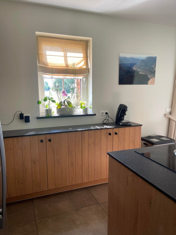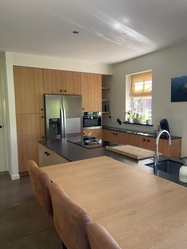 La cuisine ouverte a un îlot de cuisson et de lavage et est équipée de grands tiroirs et placards, d'une plaque de cuisson à induction à 4 feux avec hotte (Bora), d'un évier avec Quooker, d'un lave-vaisselle et d'un plan de travail en pierre naturelle. Un mur de placards équipé d'appareils encastrés, comprenant un four/micro-ondes et un frigo/congélateur américain, et il y a aussi suffisamment d'espace de rangement autour. L'unité de cuisine dispose d'un comptoir de bar avec des places assises pour 6 personnes.
