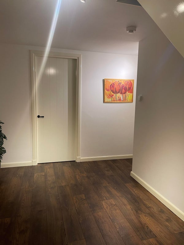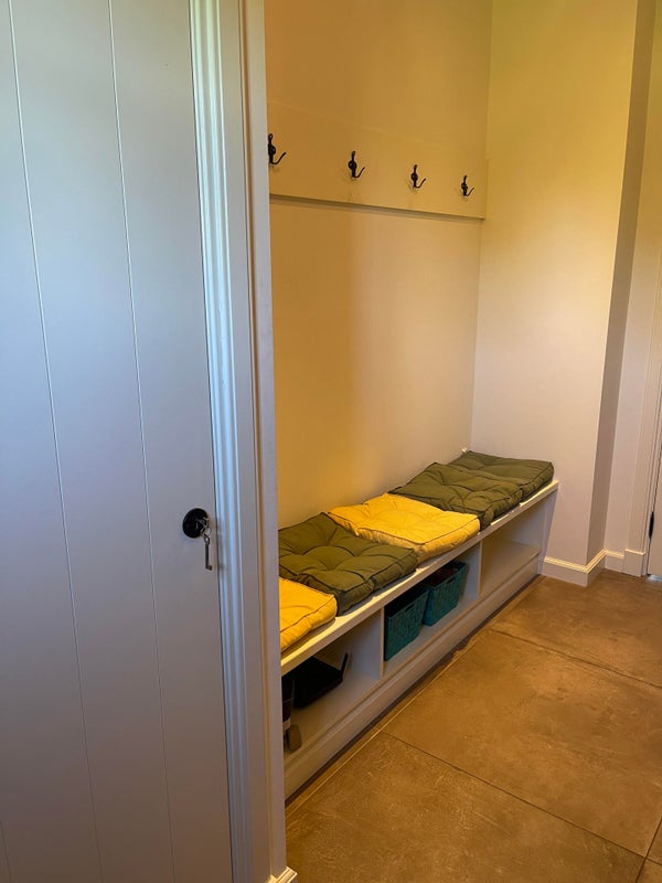 Vous avez également accès à un hall menant à la porte arrière depuis la cuisine, où se trouvent un WC avec lavabo et un placard.