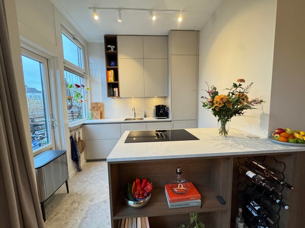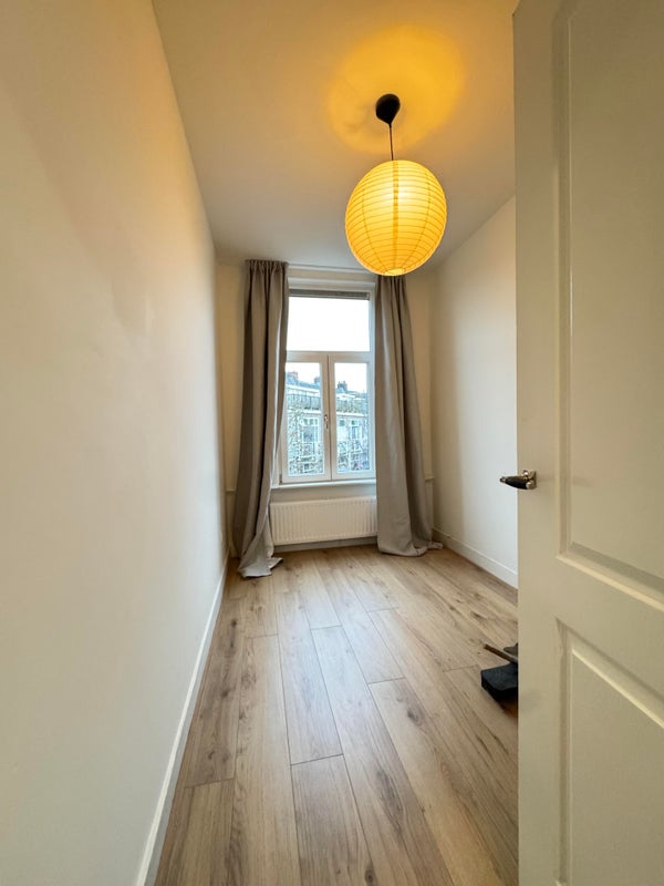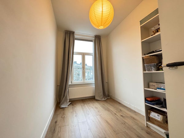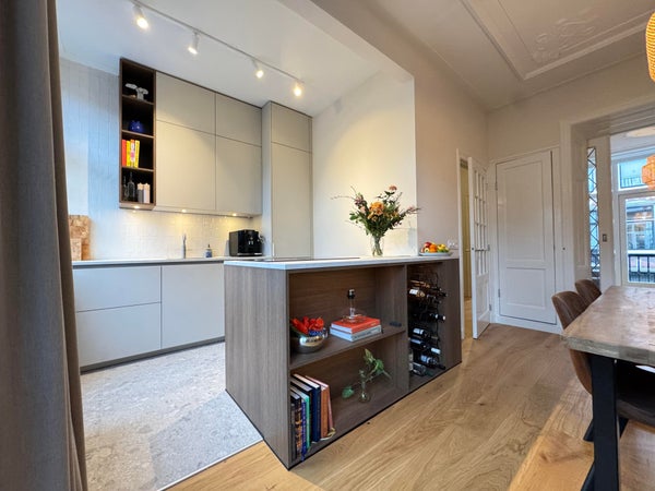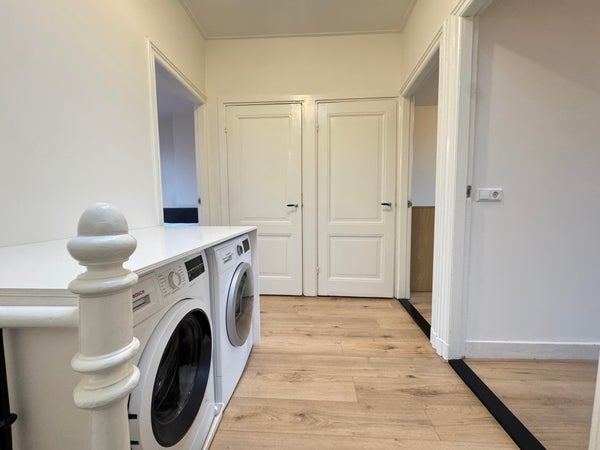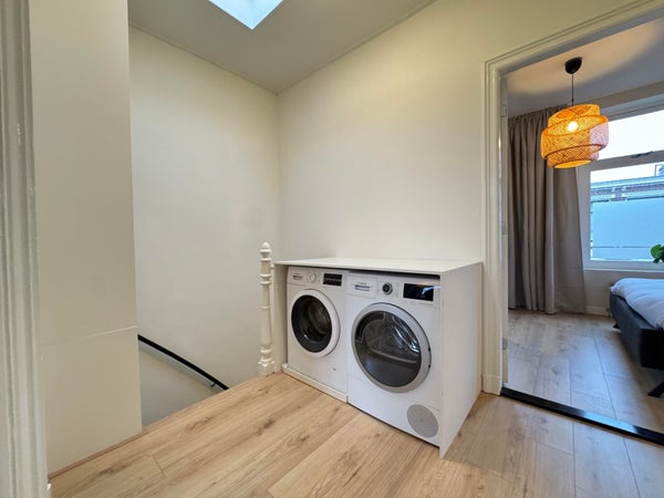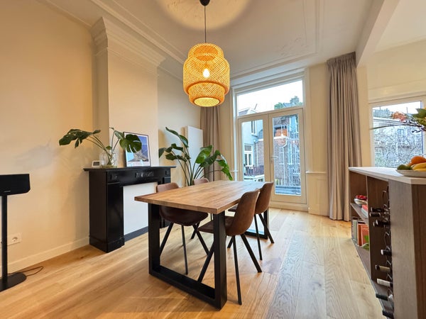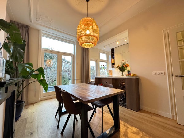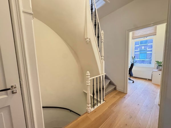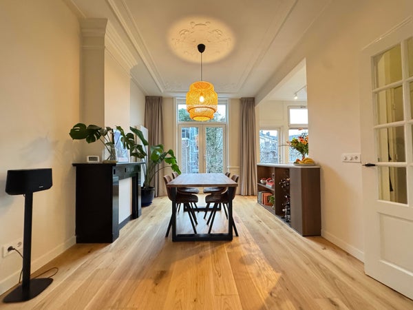 Par l'entrée, vous atteignez le hall spacieux avec des toilettes séparées. À l'avant, se trouve un agréable bureau, idéal comme espace de travail à domicile. Le salon en suite spacieux est lumineux et agréable, et donne accès à un balcon à l'avant. À l'arrière de la maison se trouve une grande salle à manger avec une cuisine ouverte moderne, équipée de tous les appareils électroménagers nécessaires. De la salle à manger, vous avez accès à la grande terrasse sur le toit à l'arrière, qui sera réalisée dans la semaine à venir et constituera un agréable et calme espace extérieur. Tout cet étage se caractérise par les hauts plafonds typiques de la période de construction autour de 1900.