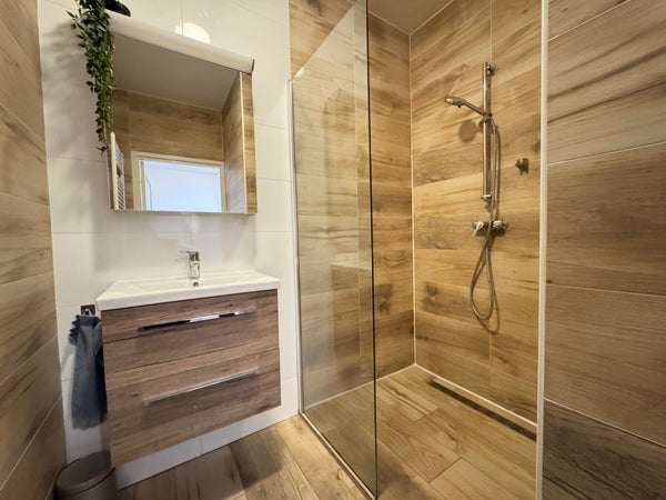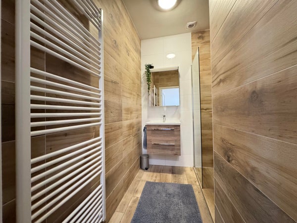Un escalier fixe mène au deuxième étage avec à nouveau une grande mezzanine. Ici, se trouvent les installations pour la machine à laver et le sèche-linge, ainsi que diverses pièces. À l'avant se trouve la spacieuse chambre principale, disposant de nombreux espaces de rangement intégrés. La salle de bains moderne dispose d'une grande douche à l'italienne, d'un meuble lavabo élégant et d'un radiateur sèche-serviettes. De plus, il y a des toilettes séparées. Cet étage compte également une seconde grande chambre et une troisième chambre, un peu plus petite. Ces deux chambres seront livrées non meublées.
