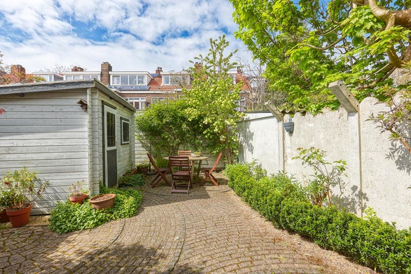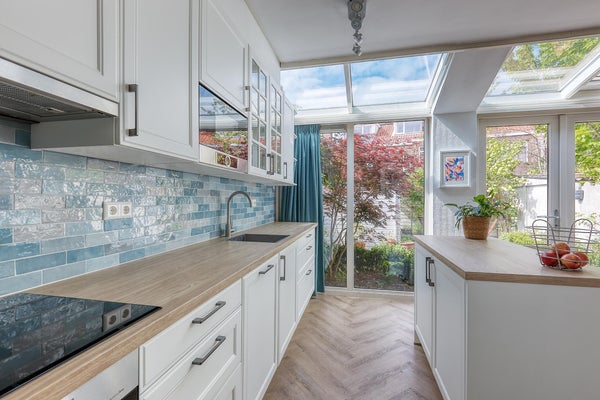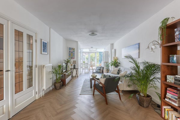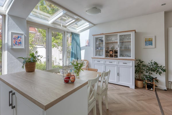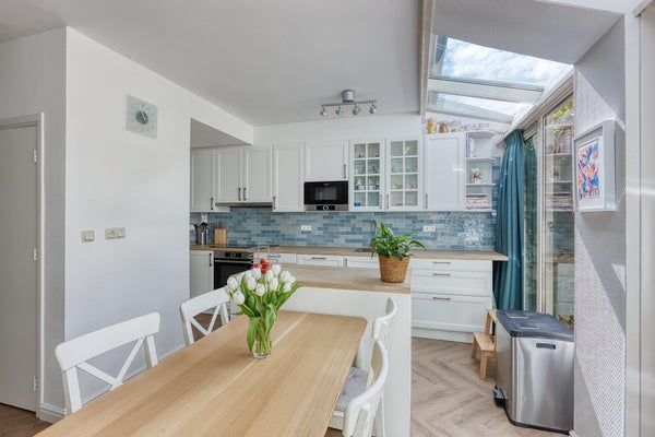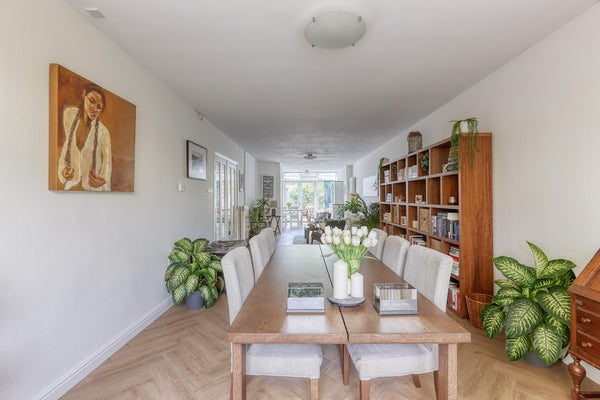 Rez-de-chaussée : jardin avant avec dépôt à vélos, hall spacieux avec toilettes séparées et salle de bains avec douche, lavabo, machine à laver et sèche-linge. Le très spacieux salon de 15m x 3,70m bénéficie d'un bon éclairage grâce à la paroi vitrée dans le jardin arrière. La grande cuisine ouverte est équipée de tous les appareils désirés avec un jardin ensoleillé à l'arrière face au nord-ouest avec une cabane de jardin.