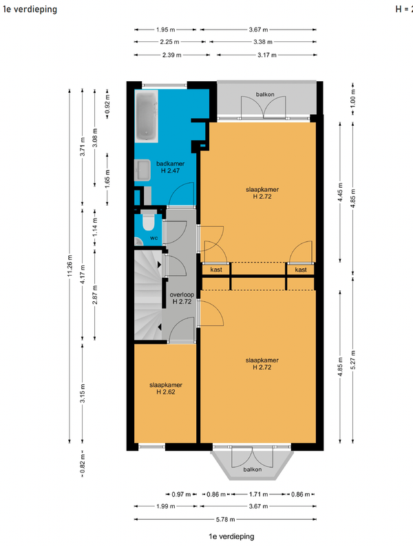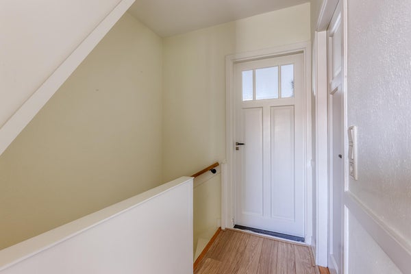 Au premier étage se trouvent 3 chambres, un toilette séparé et une salle de bain avec baignoire et lavabo. La "chambre principale" à l'arrière mesure 4,45m x 3,70m avec un balcon au nord-ouest de 3m x 1m. La 2ème chambre à l'avant mesure 4,85m x 3,70m avec un balcon au sud-est et la petite chambre/bureau à l'avant mesure 3,15m x 2m.