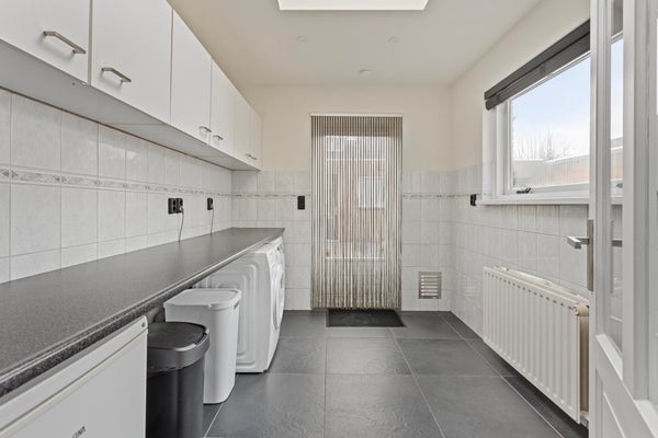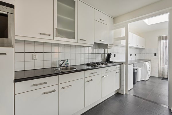 Cuisine moderne avec appareils encastrés et buanderie attenante avec aménagement de blanc et accès au jardin.