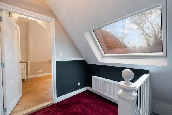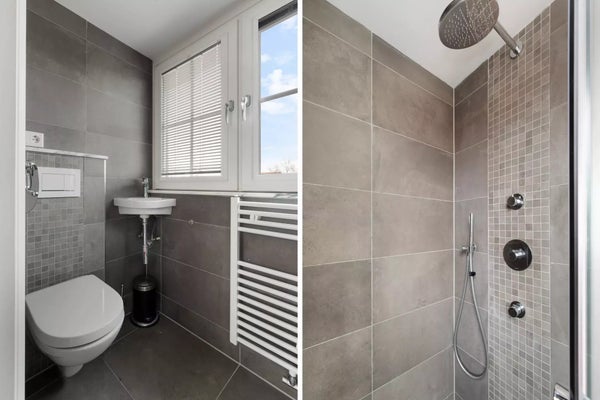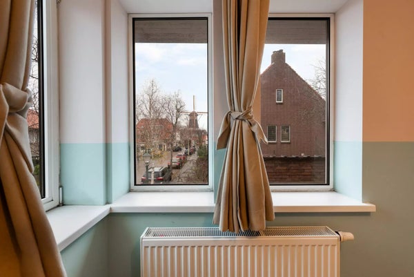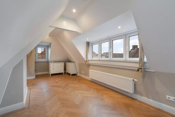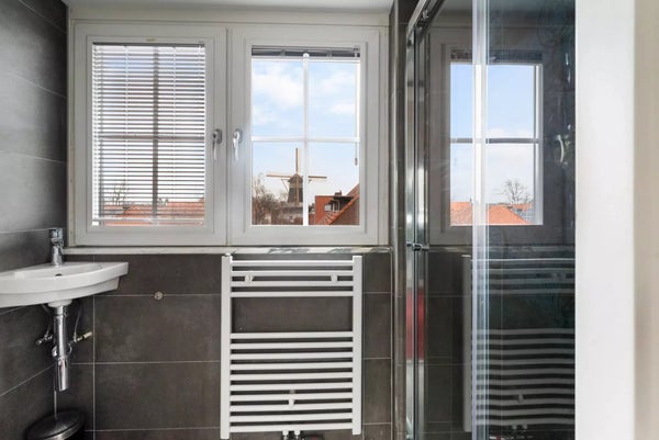 Premier étage : le palier offre un espace de rangement pratique et un accès à 3 chambres. La chambre principale spacieuse à l'avant dispose d'armoires encastrées et offre une superbe vue sur la verdure et le kiosque à musique de la place Burcht. La salle de bain de luxe est équipée d'une baignoire, d'une douche séparée, d'un WC et d'un meuble-lavabo au design élégant. À l'arrière se trouve une chambre spacieuse avec sa propre terrasse sur le toit, tandis que la troisième chambre offre une vue magnifique sur le moulin à vent historique 'Windlust'.