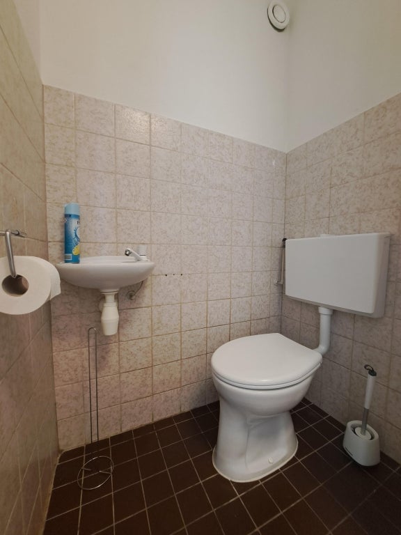 Au premier étage, vous trouverez trois chambres de bonne taille et une salle de bain simplement meublée avec cabine de douche, deuxième toilette, lavabo avec robinet et miroir, radiateur et une petite fenêtre pour ventilation naturelle.