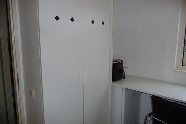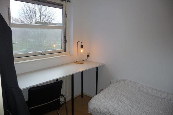 Room (approx 10m2) on the second floor with -built-in- wardrobe, bookshelf and table top fridge (in room). Laminate on the floor. Includes single bed with mattress, bedside table, small side table.