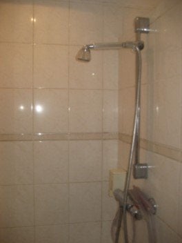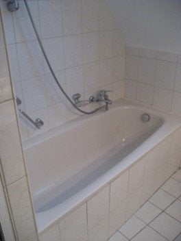 The bathroom has a bathtub, sink, shower and washing machine connection.