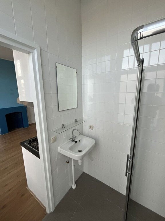 The studio has a living area of approximately 20.8 m2 and is located on the first floor. The property features a living room, a bedroom with an open kitchen equipped with built-in appliances such as an extractor hood, induction cooktop, and refrigerator. Additionally, the studio has a tidy bathroom with a shower, sink, and toilet.