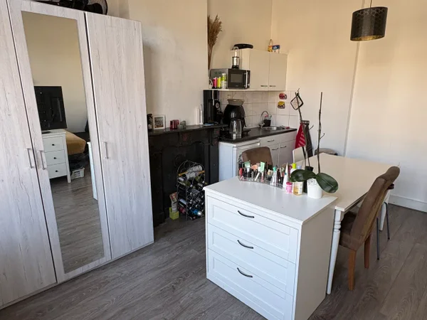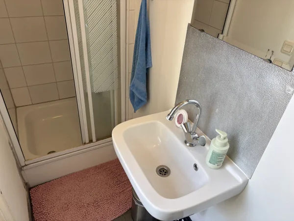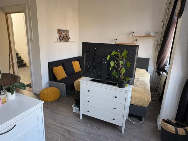 Bright spaciuos room with own kitchen unit and a French balcony situated on the first floor in a small student house. The bathroom with shower and toilet is shared with 2 other students.