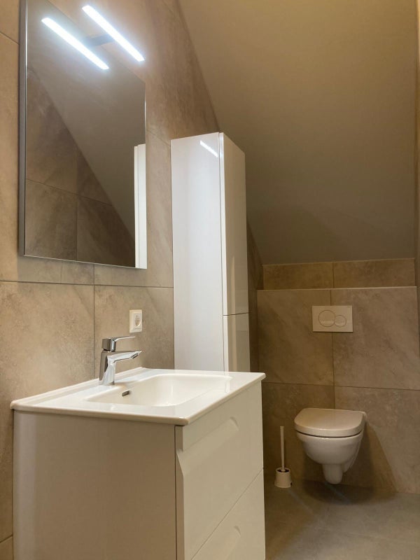 The bathroom (approx. 3.6m2) consists of a shower, hanging toilet and sink with washbasin furniture.