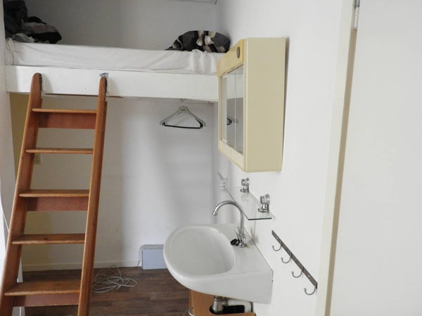 La camera arredata è sorprendentemente ampia e notevolmente luminosa grazie alle grandi finestre sul retro dell'edificio. La camera è dotata di un soppalco, facilmente utilizzabile come "camera da letto", mantenendo così l'intera area calpestabile a disposizione per la vita. Inoltre, questa camera è dotata di un lavandino e alcuni armadi fissi.